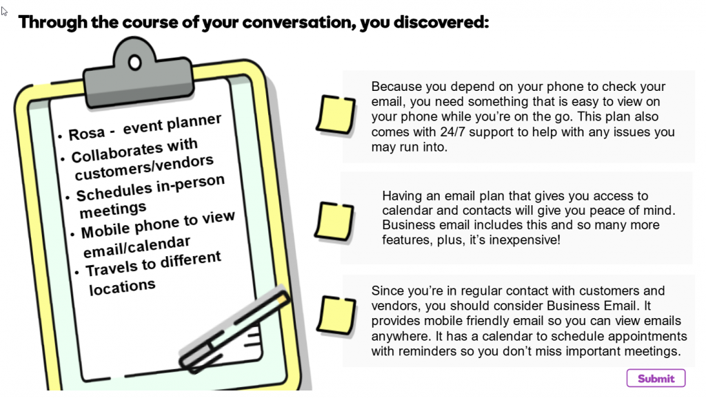 Developed an interactive, scenario-based eLearning module focused on helping representatives understand, position, and recommend GoDaddy’s Professional Email Services.